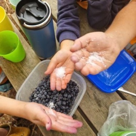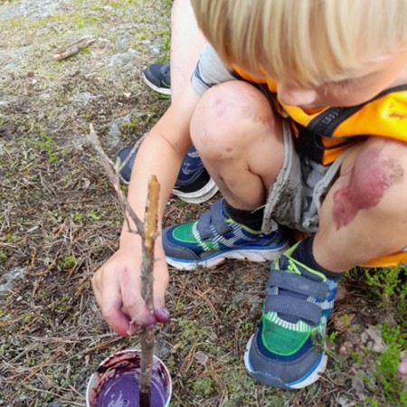 Barna hadde hver sin kopp, og sankingen begynte. Noen kopper fyltes raskt, mens noen kopper var mistenkelig tomme …….. Som kjent så er det vanskelig å skjule når blåbærene går inn i munnen og ikke i koppen . Men det er jo dette som er hele sjarmen med å plukke bær i skogen, det er viktig å spise og kose seg også 😊