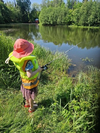 Det var litt lite napp til å begynne med, men så begynte det å ta seg opp. Og der endelig så fikk vi en fisk på kroken, da var det bare å sveive inn til stor begeistring fra alle barne. Ikke nok med det, vi fikk ennå en fisk på kroken.