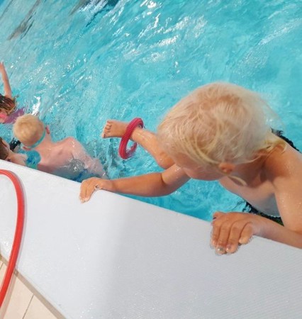Barna fikk deretter øve seg på det å redde seg selv opp fra vannet, ved ilandstigning opp bassengkanten.