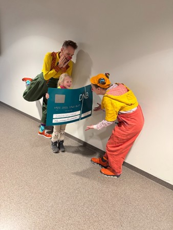Barna i Møllerdammen Naturbarnehage fikk en ekstra spesiell opplevelse, da de overrakte sjekken på 3780 kroner – de fikk nemlig møte Sykehusklovnene personlig!