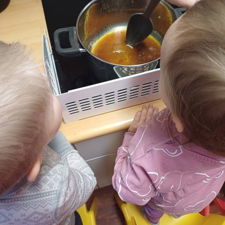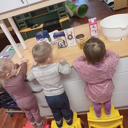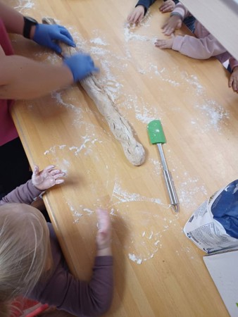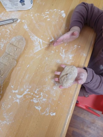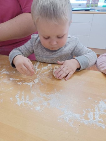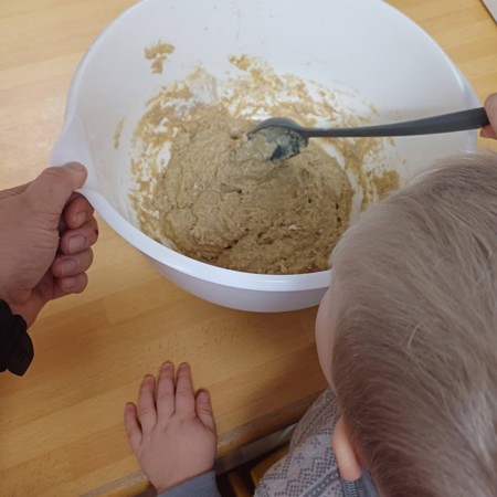 Gøy å måle, helle over i bollen og passe smøret når det smelter, forme rundstykkene. Vi koste oss med