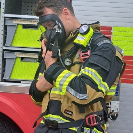 Den ene brannmannen tok på seg røykdykker utstyret sitt, og viste barna både maske og luft tankene,