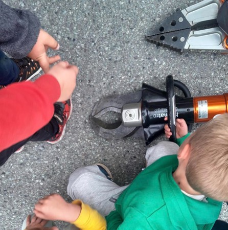 Det var tre hyggelige brannmenn som viste oss rundt på bilen, hvor vi fikk se alt det flotte utstyret de har til disposisjon når ulykken er ute. Vi fikk se klippe verktøyet de bruker ved bilulykker. Vi fikk også stå forran viftene de bruker til å tømme rom for røyk ved brann. De kan vi si båste godt......