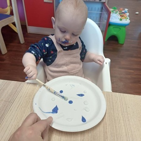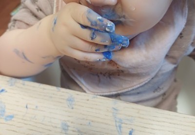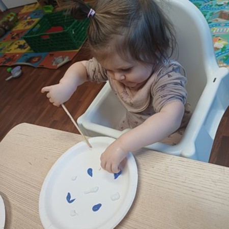 Barna har malt med fargene hvit og blå, som representerer is, og brukt sansene sine aktivt i møte med maling og materialer.